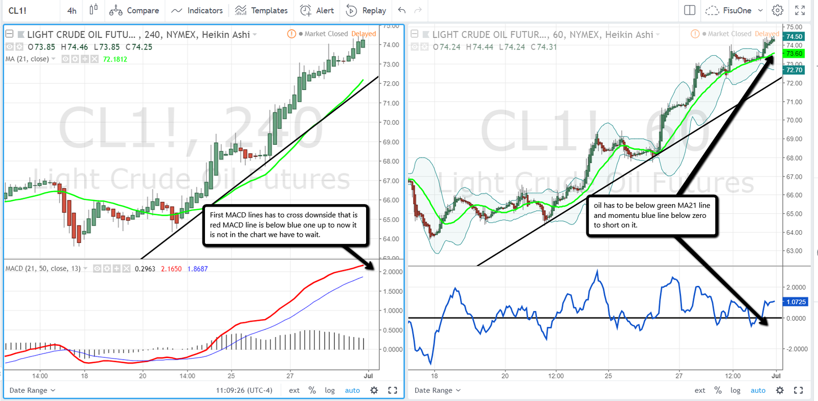 The future of the oil seems to be a bit tired of the rise is noted in the graph on the left that the lines of MACD begin to want to join if this occurs and the red line of MACD is placed below the blue line will have the beginning of a potential short selling trend of this asset. Therefore, if we go to the chart on the right we will have to wait with this tendency in play that the oil is placed under the green line of MA21 and the momentum is kept below zero. Potential target if this happen will be 69-70.