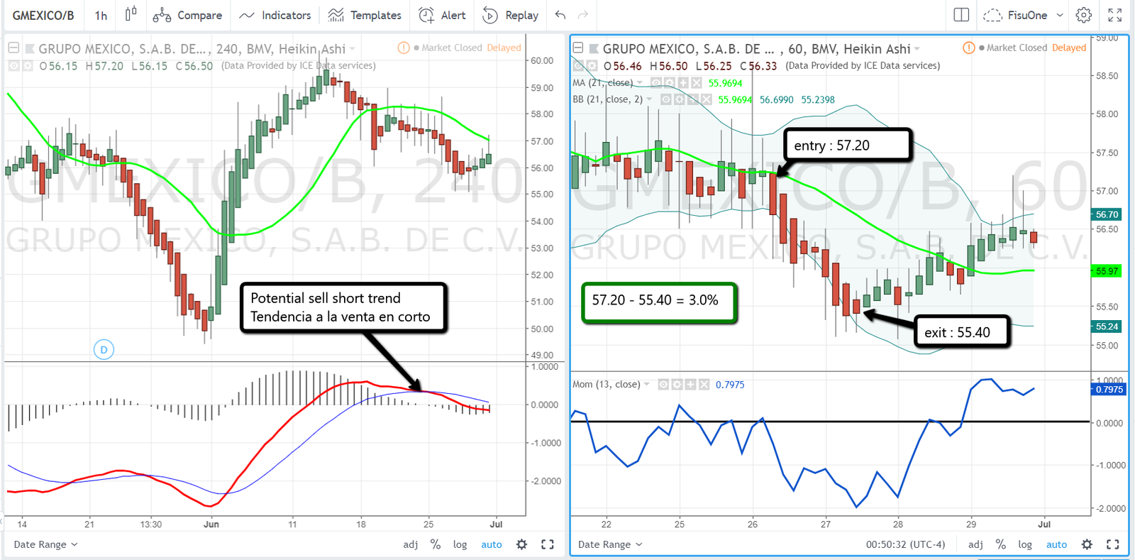 The same as explained in the other examples GMEXICO presented a sell short trend with the crossing of MACD lines on the 4hr chart on the left, then I have to look for sell short trades following this trend, as indicated in the graph on the right where the entry was at 57.17 and the exit at 55.41 giving the price ration a variation of 3%.