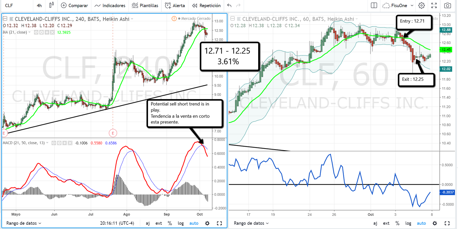 At the beginning of this week a short selling trend was identified in CLF, so this week a short sale trading was sought, which was offered at 12.71 as input, this is when the MA21 green line is cut down and the exit at 12.25 was presented when the price starts to lateralize and no longer continues its decline. This trade gave 3.61% in the week.