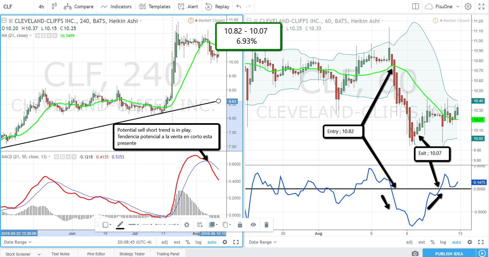 CLF offered in the 4hr chart on the left a potential sell short trend, this can be seen with the crossing of MACD lines and as we know about the FisuOne® method, it is a short selling trend when the MACD red line is below the blue one.