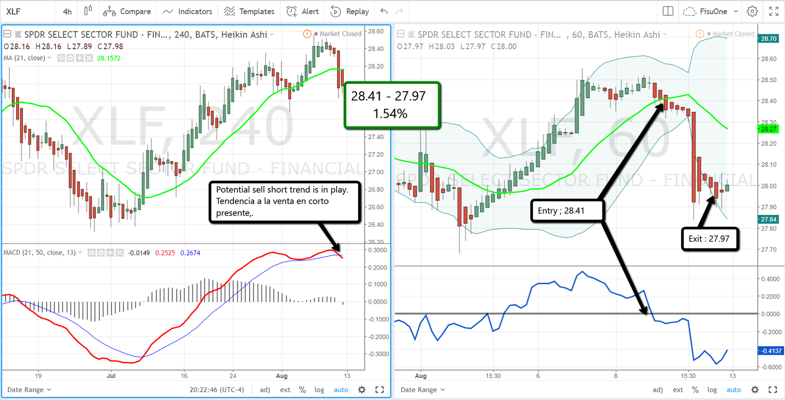 With XLF the same thing happened as with CLF, the trend was identified in 4 hr and it was operated in the direction of the sell short trade in the 1hr chat on the right and 1.54% was achieved.