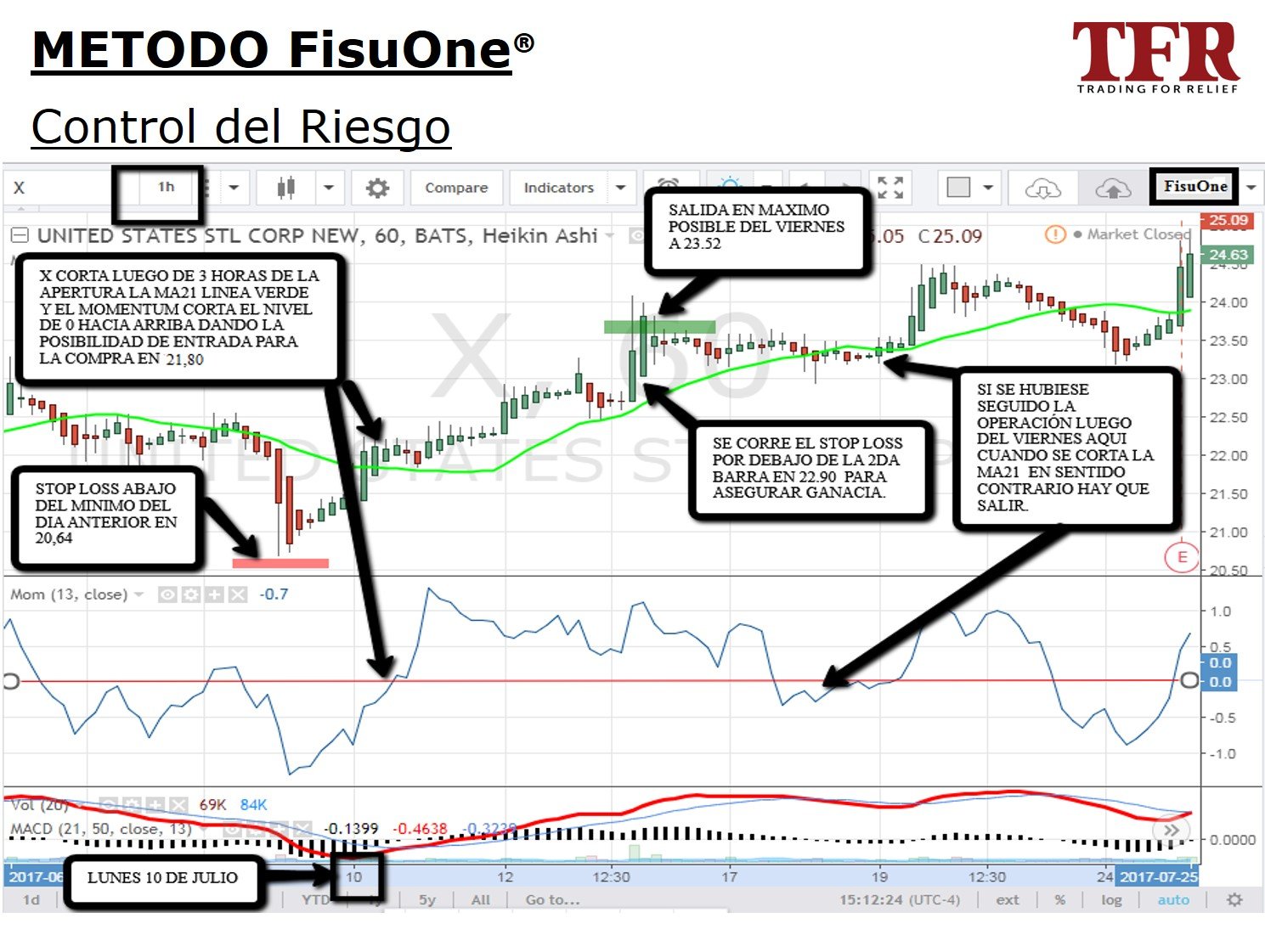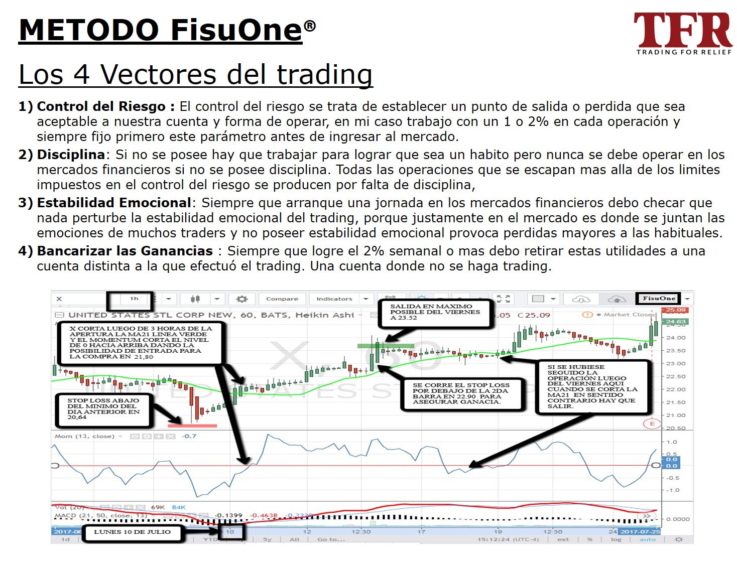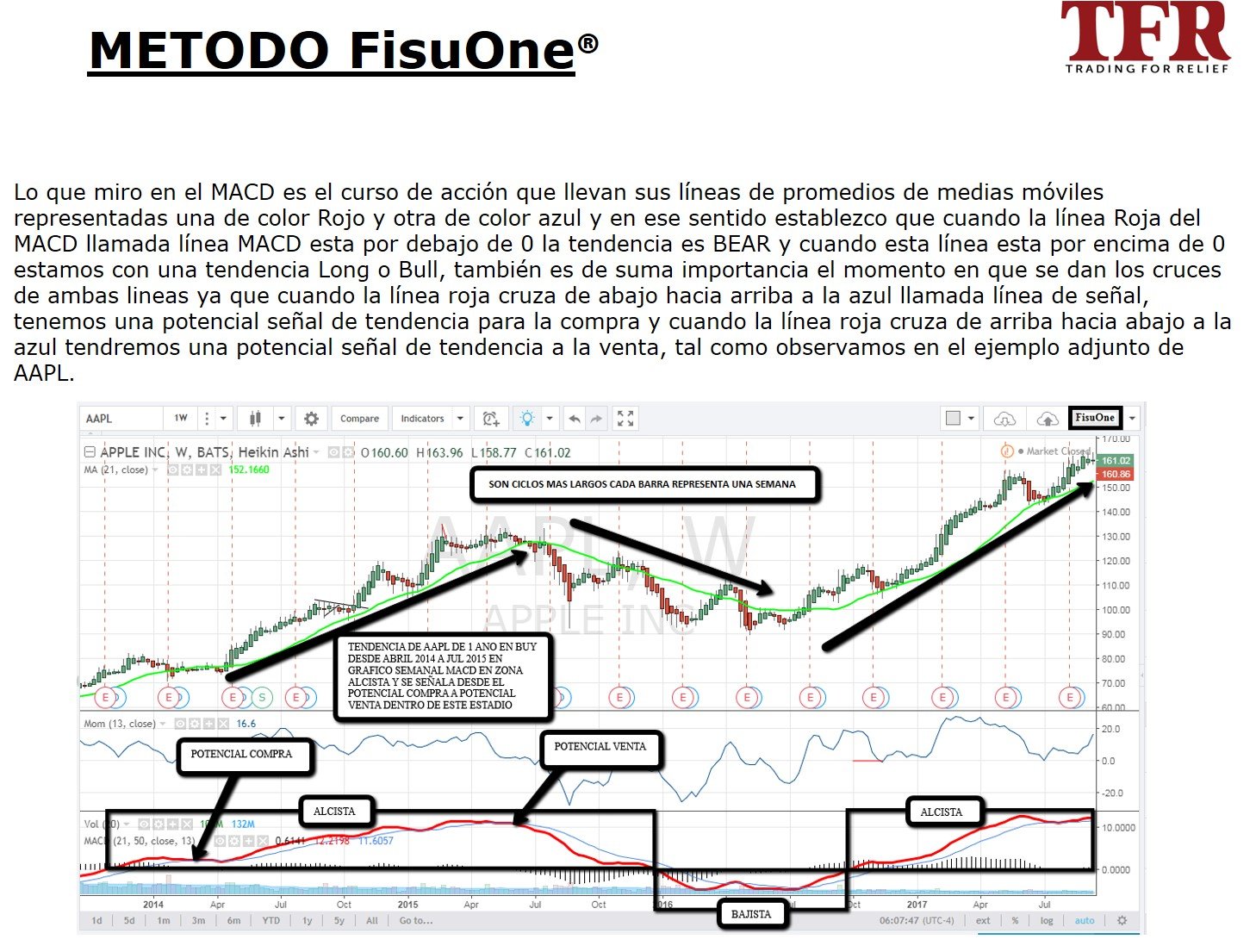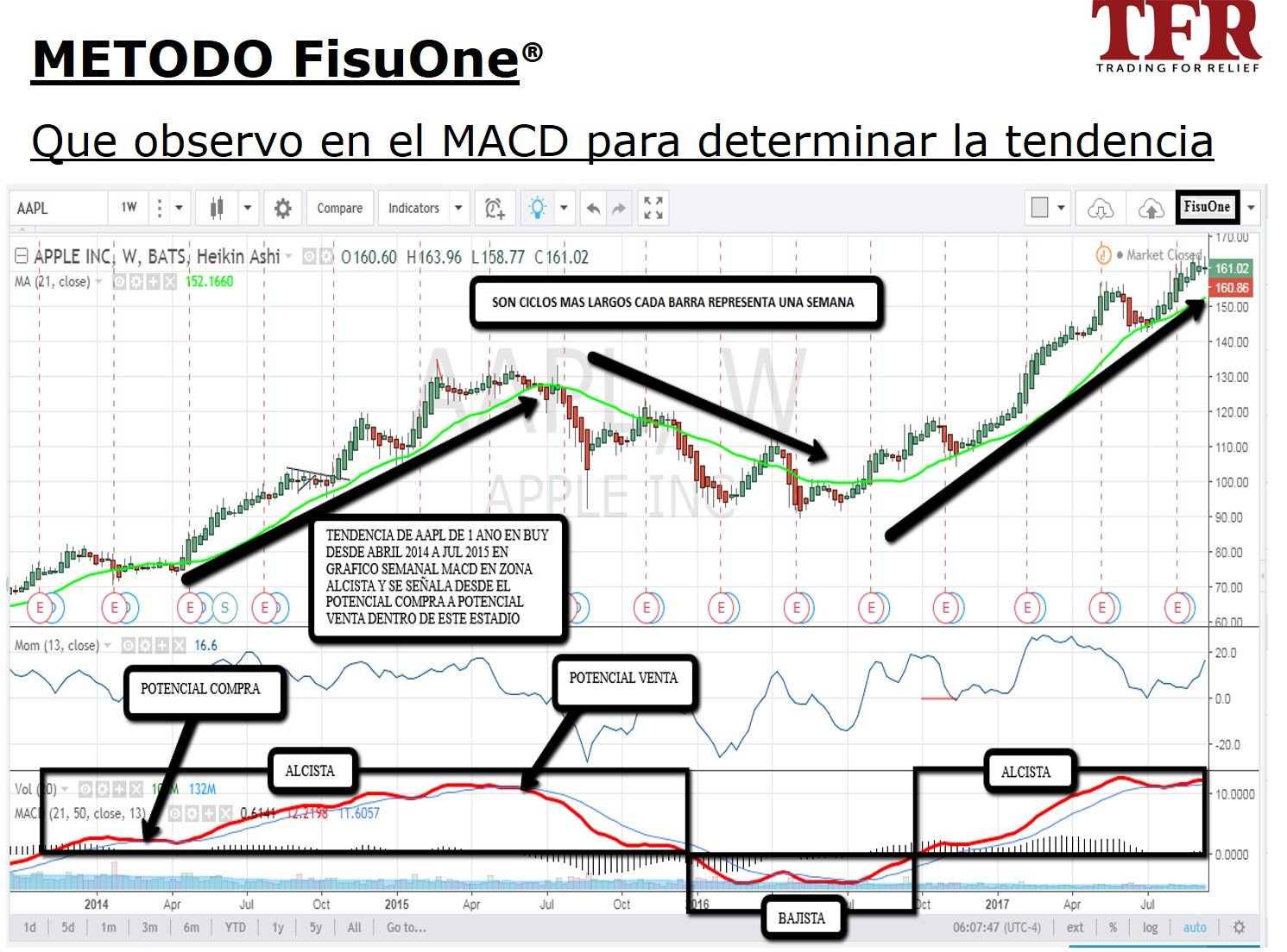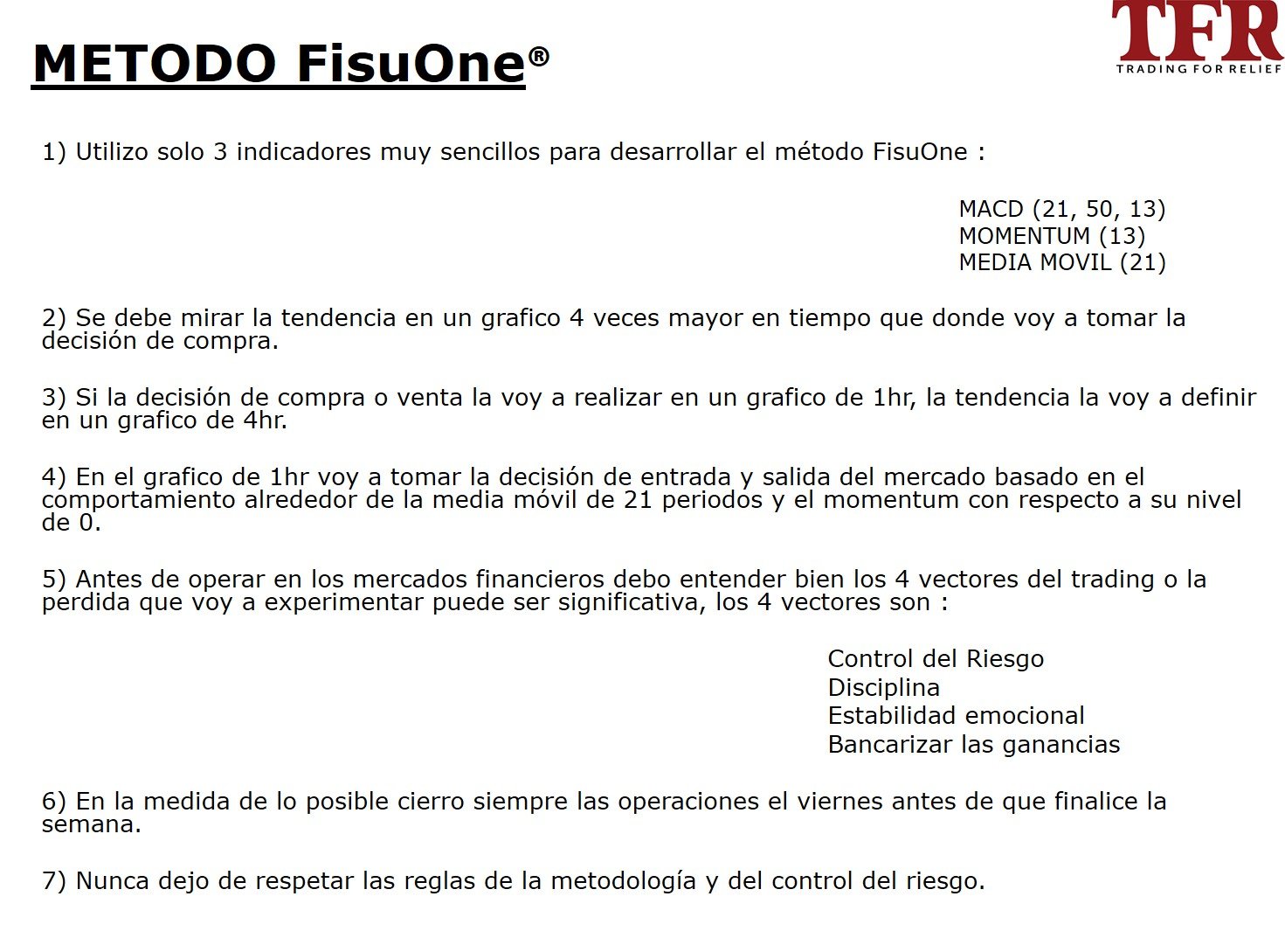El método FisuOne se basa en el concepto de identificar la tendencia de un instrumento financiero en un tiempo que es 4 veces mayor al tiempo donde voy a tomar la decisión de entrada y salida.