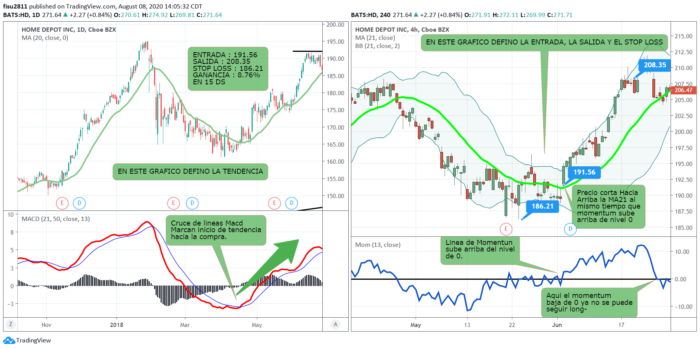 Home Depot dio una tendencia a la compra en el grafico de la derecha que es un grafico diario y luego en la izquierzda que es un grafico de 4hs buscamos la entrada y salida del trade de compra que siga la tendencia.