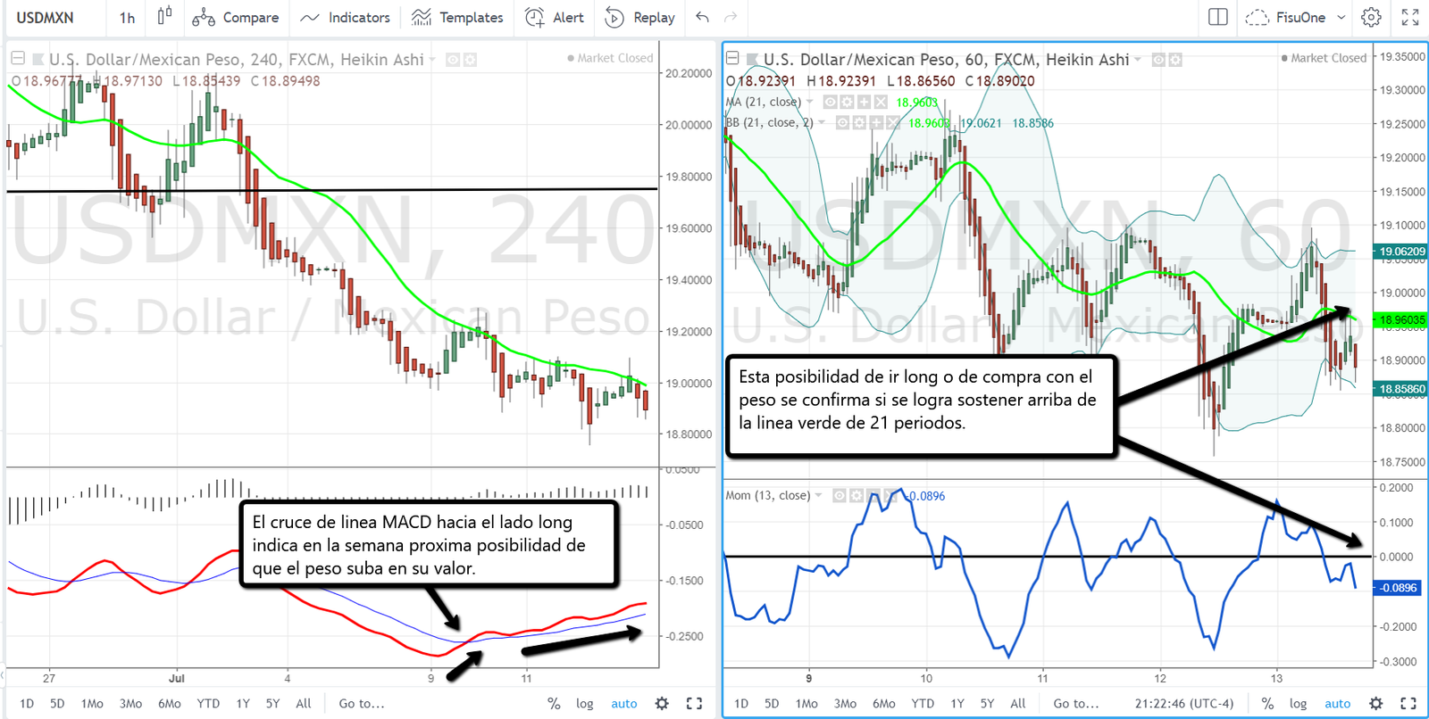El peso en la semana proxima tiene posibilidades de ir hacia arriba asi lo indica el cruce de lineas MACD en el grafico de 4hrs por lo tanto para ver si este movimiento tiene fortaleza debemos mirar en el grafico de la derecha siguiendo la metodologia FisuOne® si el peso logra sostenerse por encima de la linea verde de 21 periodos y el momentum por arriba de cero podrian darse niveles del peso arriba del 19,30.