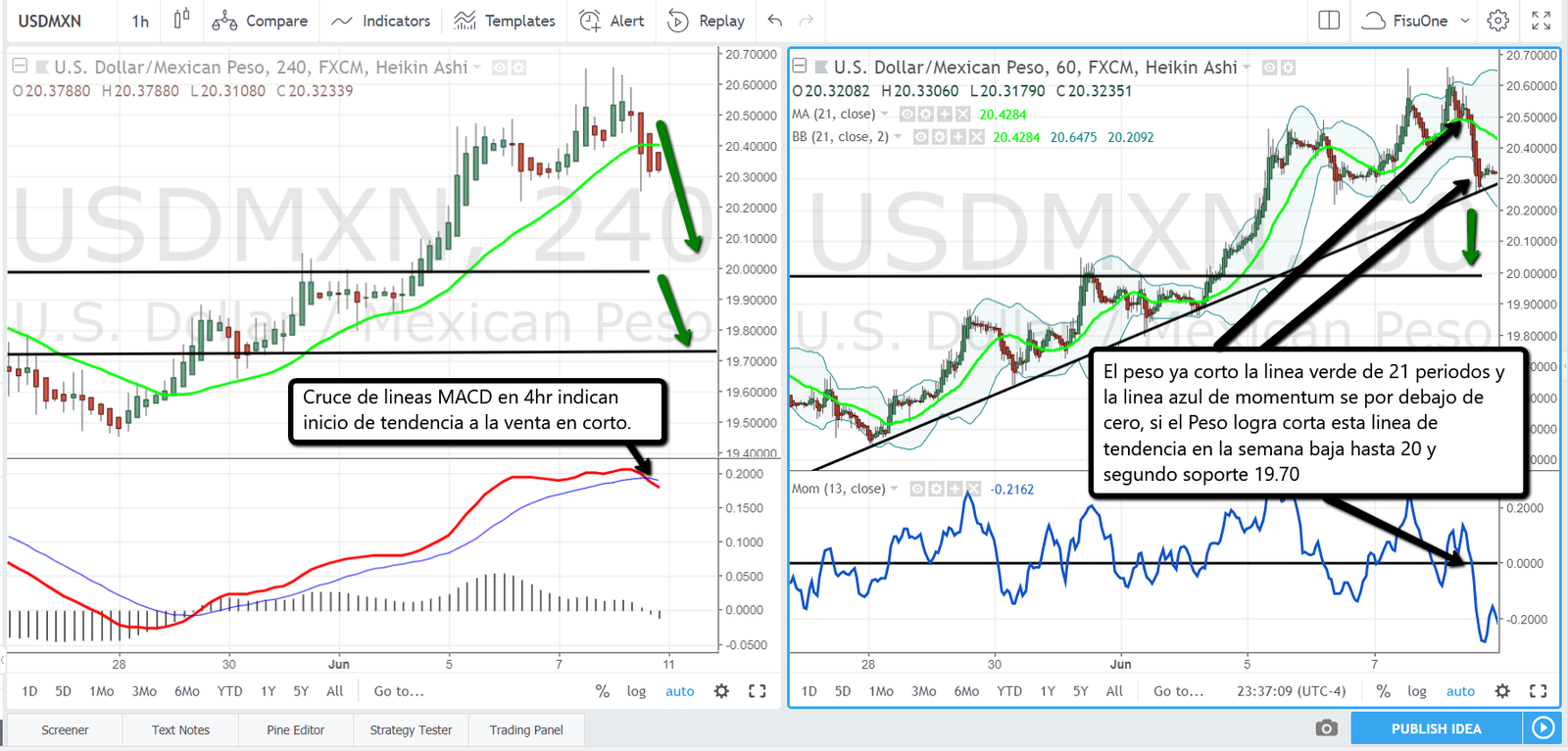 Se observa para esta semana un inicio de cruce de líneas de MACD en gráfico de 4hrs lo cual habilita una nueva tendencia a la venta en corto de la divisa para lo cual habrá que estar preparado para observar que ya corto en el gráfico de la derecha de 1hr la línea verde de 21 periodos y la línea azul de momentum acompaño por debajo de cero indicando la fortaleza del peso vs el dólar.