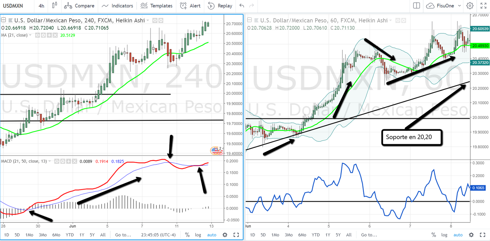 En el gráfico de la izquierda se busca determinar la tendencia que el peso tendrá en la semana que transcurre en esta semana se ve una posibilidad que inicie una potencial tendencia hacia la compra, esto se confirmara si la línea roja de macd sigue por encima de la línea azul de señal hacia arriba