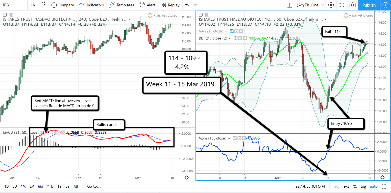IBB la semana pasada se fue con tendencia de venta en corto y se gano 4.82%, en esta semana estaba la tendencia long presente y entonces yendo long se ganó otros 4.2%, lo bueno del método FisuOne como en el ejemplo de IBB es que hay tendencia long al estar la línea roja de Macd por encima de zero pero la semana pasada como hubo cruce de línea de MACD dio también potencial venta en corto, y en ese caso hay que estar atentos a lo que sucede en ell grafico de 1 hr y ver que si el precio va para arriba de la MA21 el trade debe ser long para este ETF.