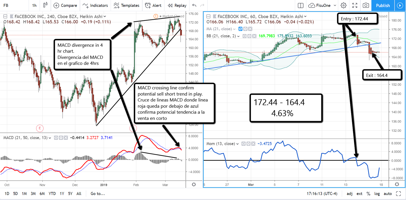En el gráfico de 4 horas a la izquierda, FB muestra una interesante divergencia entre el MACD y el precio esta señal es muy poderosa y muy rara de ver en 4hrs y luego de seguir la misma se confirma un cruce de líneas MACD hacia la tendencia de venta en corto. Por lo cual se buscó señal de entrada en el gráfico de la derecha para FB en el sentido de venta en corto.