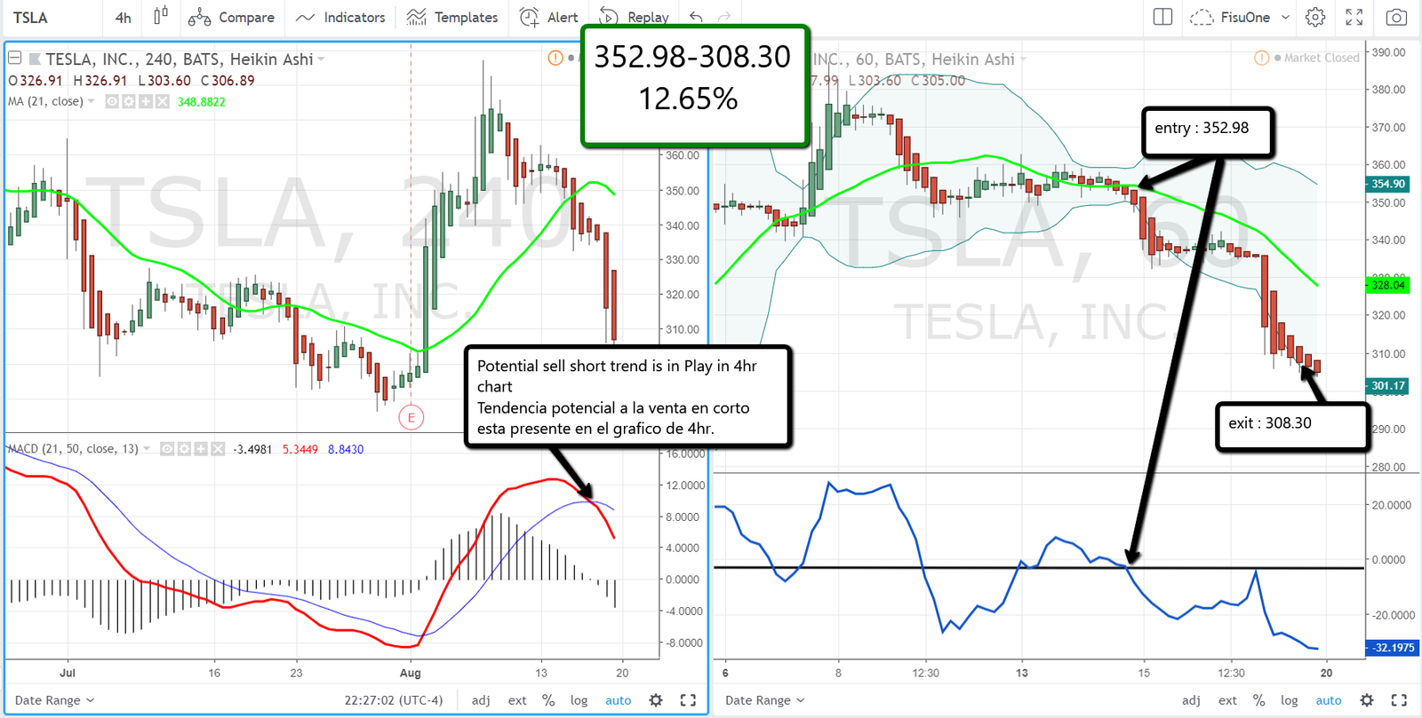 TSLA luego del Tweet de Elon Musk provoco en el gráfico de 4hr un cruce de líneas hacia la venta en corto esto es que la línea roja de MACD esté por debajo de la azul. Cuando esto sucede estamos en presencia de una potencial tendencia a la venta en corto, por lo cual debemos ir al gráfico de 1hr y buscar en consecuencia operaciones de venta en corto. Esto se dio cuando TSLA corta de arriba hacia abajo la línea verde de 21 periodos móviles dando una entrada en 352.98 y una salida cuando comienza a lateralizar el precio y se termina la semana en 308.30.