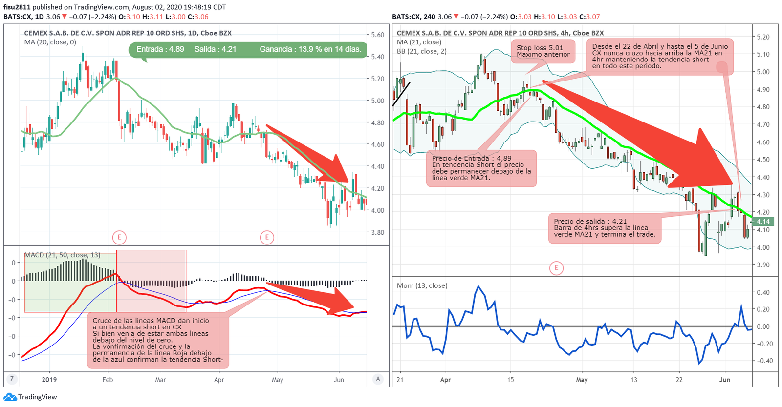 En este caso hay que trasladarse al grafico de la derecha de 4hrs para buscar el punto de entrada y el mismo aparece cuando el precio cruza por debajo la linea verde MA21 y se mantiene por debajo de ella, en todo el recorrido que el precio siga por debajo de esta linea verde la posición de venta en corto se sostiene.