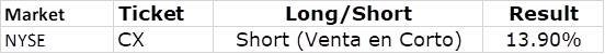 Cemex ya habia mostrado con anterioridad debilidad en el precio y esto lo siguio demostrando en el grafico diario de la izquierda donde en el metodo FisuOne® cuando la linea de MACD roja de señal cruza por debajo a la linea azul de MACD confirma tendencia a la venta en Corto.