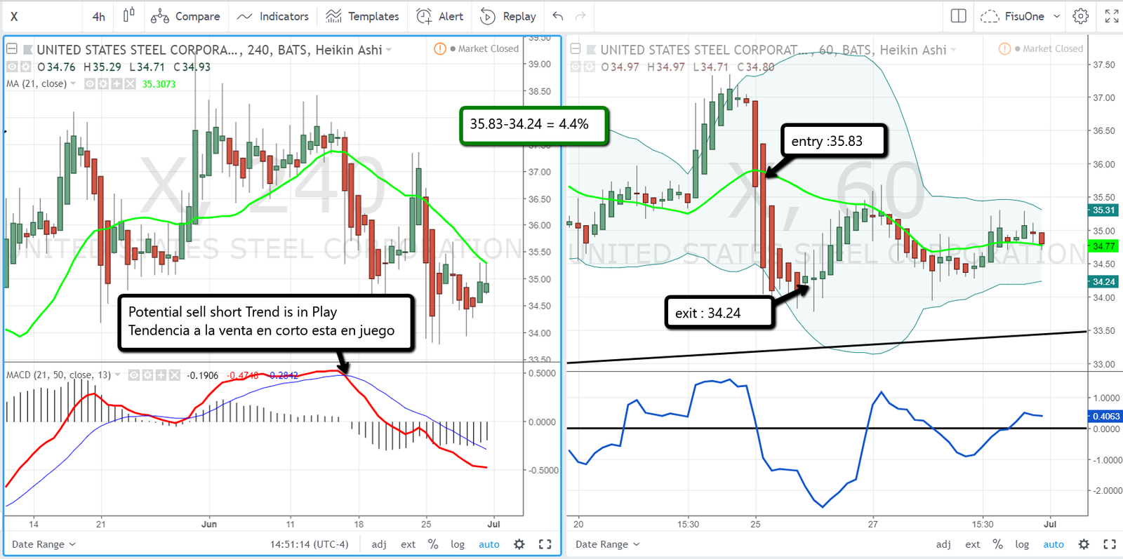 US STEEL (X) Presento en la semana en el gráfico de 4hs cruce de líneas MACD hacia la baja por lo cual este cruce señalo tendencia a la venta en corto. Por lo tanto en el gráfico de 1hr hay que buscar en la semana operaciones que sean a la venta en corto.