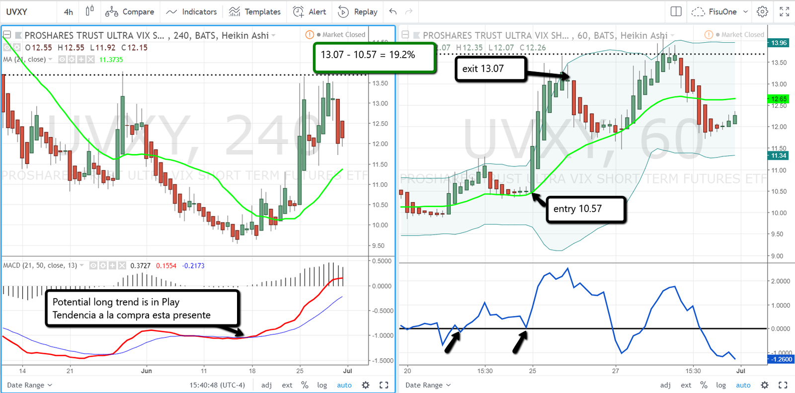 UVXY presento en el gráfico de 4hrs un cruce de líneas de MACD hacia el lado de la compra. Esto significa que hay que buscar operaciones en el gráfico de 1hr en el lado de compra. Se produce la entrada cuando UVXY cruza de abajo hacia arriba la línea verde de 21 periodos y la línea azul de momentum cruza al mismo tiempo la línea de cero de abajo hacia arriba. Esto se señala com flechas de color negro. La entrada fue en 10.57 y la salida cuando comienza a lateralizar en 13.07, cabe señalar que opero en forma muy esporádica este ETF ya que es sumamente volátil y puede provocar fuertes pérdidas en poco tiempo.