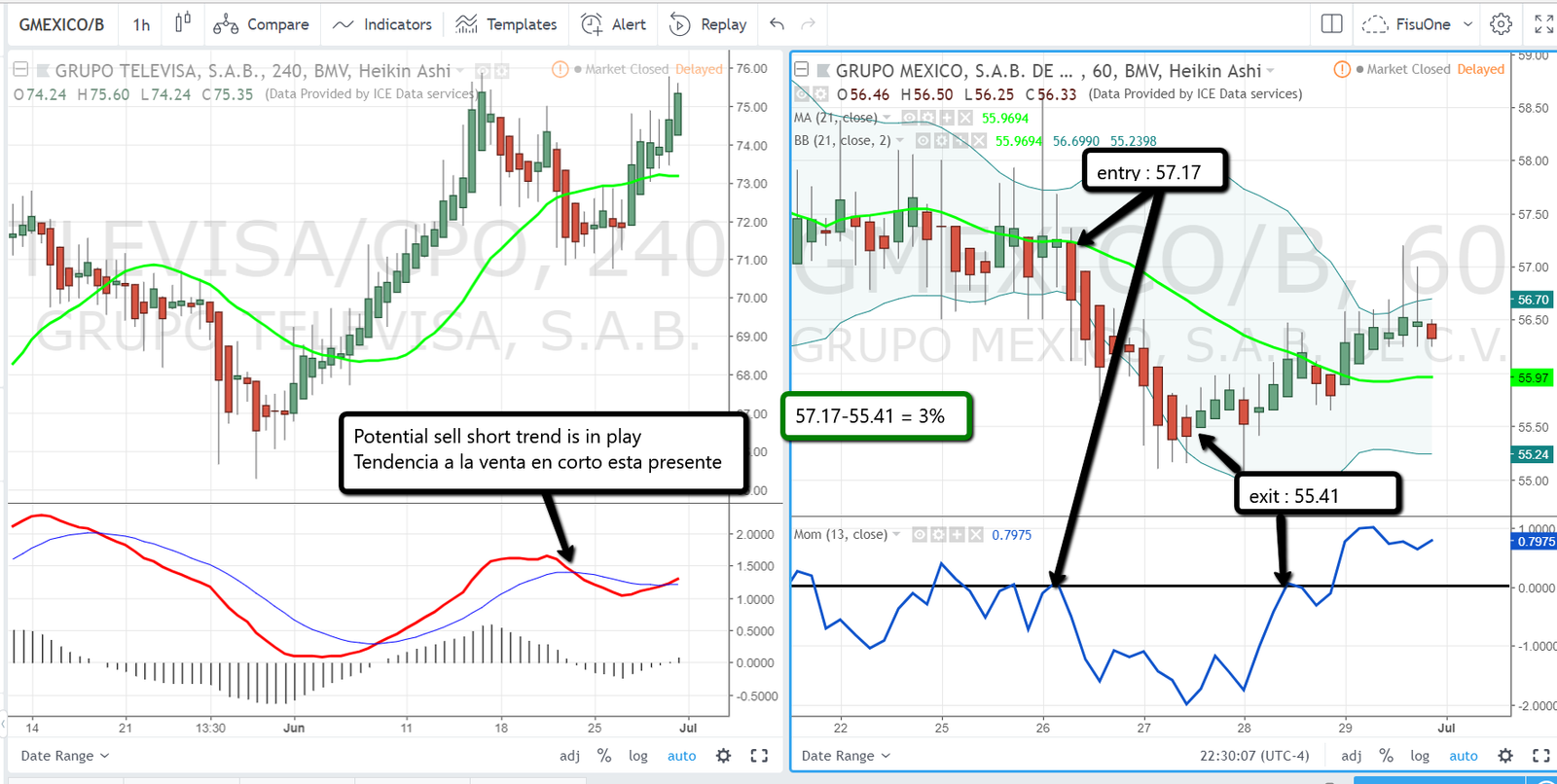 Lo mismo de lo explicado en los otros ejemplos GMEXICO presento tendencia a la vena en corto con el cruce de líneas MACD de 4hr de la izquierda, por lo cual se buscó en 1hr operaciones con esta tendencia, como se señala en el grafico de la derecha donde la entrada fue en 57.17 y la salida en 55.41 dando el rago de precio una variación de 3%.