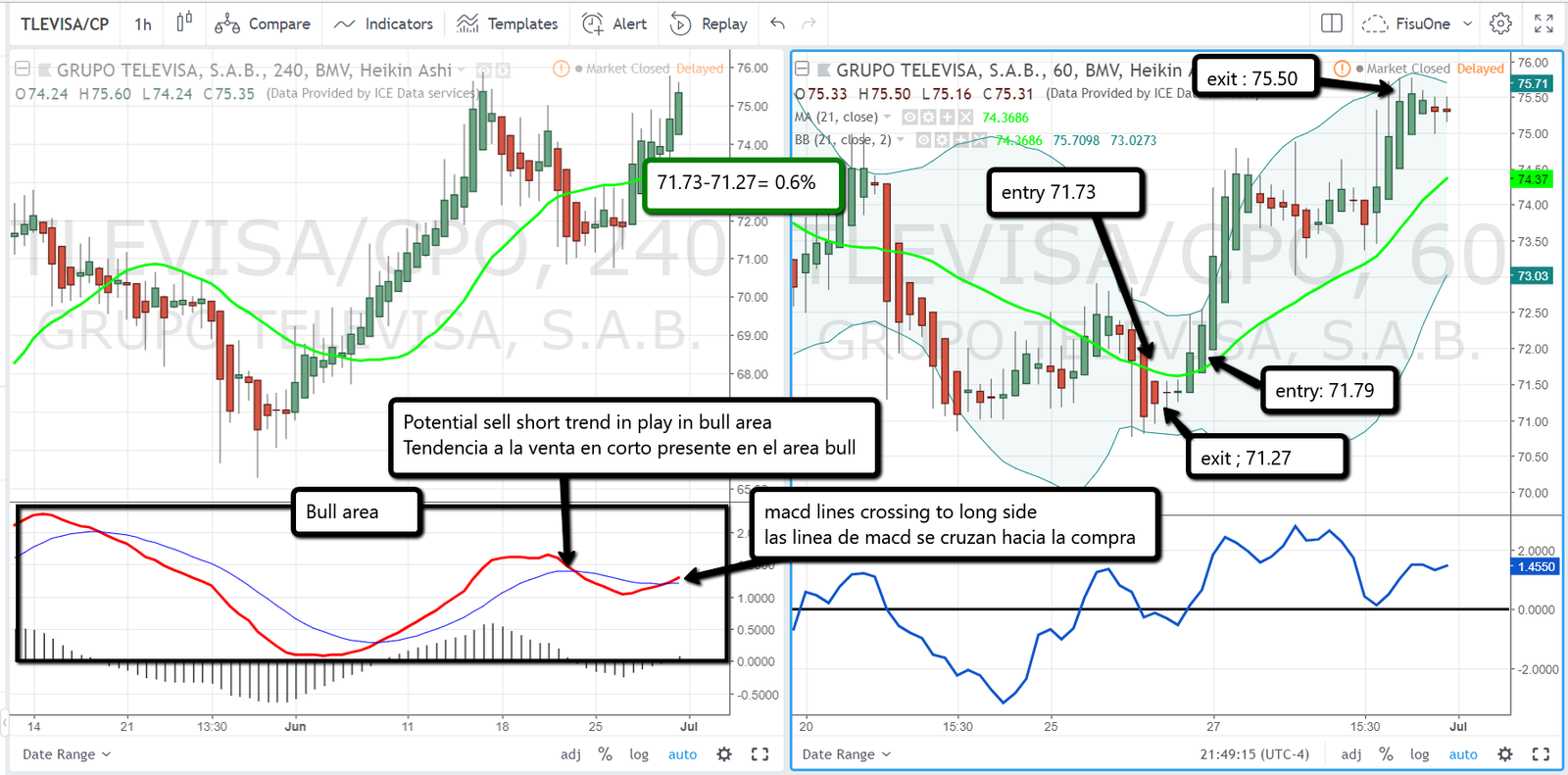 Televisa presento un cruce de líneas MACD hacia el lado corto esto es. a la venta en corto, esta tendencia dio posibilidad a que se busque una operación de venta en corto en el gráfico de 1hr, que se produce en 71.73 cuando TV corta de arriba hacia abajo la línea verde de 21 periodos, pero luego rápidamente se va hacia arriba, si se logra percibir esta corrección en 71.27 que comienza a lateralizar se sale y si no se percibió esto, hay que salir cuando corta en el sentido contrario la línea verde de 21 periodos, pero nunca quedarse en la operación si el precio corta en el otro sentido que se está operando a esta línea verde. Aquí es válido preguntarse si se podría haber operado bajo el método FisuOne® hacia la compra y la respuesta es si ya que se está en el MACD de 4 hr en la zona Bull como se explica en el libro, que cuando la línea roja de MACD está por sobre el nivel de cero se está en zona de compra pero dentro de esta zona de compra o bull área también hay cruces de líneas de MACD que señalan potencial tendencias a la venta en corto y esto es lo que se observó al comienzo de semana, pero la realidad es que en esta operación la operación bull hubiera dejado mayor ganancia que la que se adoptó de venta en corto. Esto sirve para aprender del método.