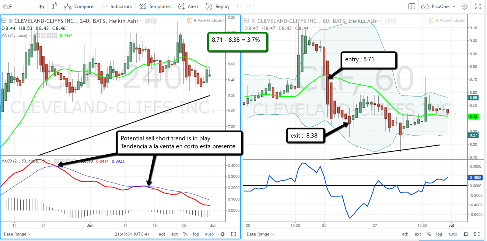 CLF presento en el gráfico de 4hr cruce de líneas MACD hacia la baja esto índico presencia de tendencia a la venta en corto. El punto de entrada se dio cuando CLF corto de arriba hacia abajo la línea verde de 21 periodos y la línea azul de momentum corto de arriba hacia abajo la línea de cero esto se produce en el nivel de 8.71 y la salida cuando el precio pierde la tendencia y comienza a lateralizar en 8.35. El rango de variación de precio de la operación fue de 3.7%.
