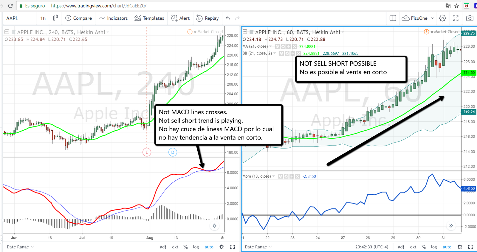 En la semana del 27 al 31 de agosto AAPL nunca logro en el gráfico de 4hr que sus líneas de MACD se cruzaran hacia abajo esto es que la línea Roja de MACD se ubique debajo de la azul para dar una señal de potencial tendencia a la venta en corto, por lo tanto en esta semana no hubo trade en este sentido. Ahora en el camino de aprender se puede visualizar que AAPL en el gráfico de 4hr estaba en una zona Bull esto es cuando la línea roja de MACD está por encima del nivel de cero en este área es posible un trade long o Buy no fue el pronosticado o buscado pero de haberlo realizado el trade buy el inicio se dio el lunes 27 en 215,50 y la salida en viernes en 228 dando 6% siguiendo todos los parámetros de método FisuOne® explicado en mi libro y en este sitio web.