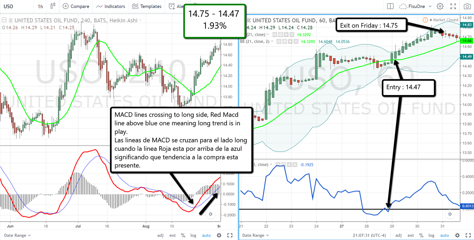En el caso de USO dio en el gráfico de 4hr cruce de líneas MACD señalando con el cruce de la línea roja por encima de la línea azul, a partir de ello se busca en el gráfico de la derecha de 1hr, cuando USO cruza la línea verde MA21 y al mismo tiempo la línea de momentum cruza el nivel de cero indicando fortaleza en el movimiento de compra y estableciendo el punto de entrada en 14.47 y el punto de salida con la llegada del viernes y la lateralización del precio en 14.75 dando este trade en la semana 1.82%.