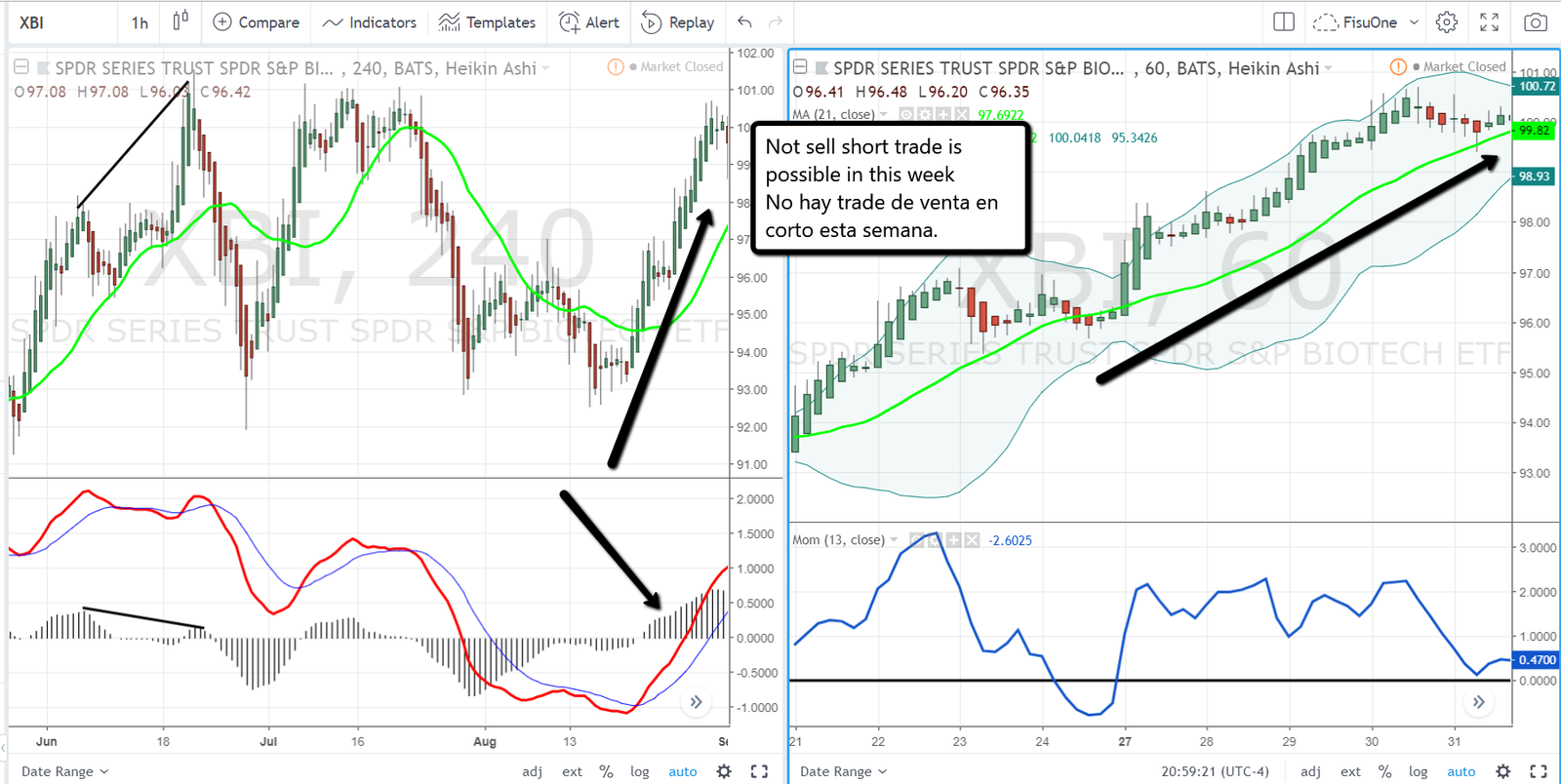 Mismo caso que con AAPL, XBI no dio tendencia a la venta en corto por la falta del cruce de las lineas MACD en 4hr hacia abajo, por lo cual no se puede hacer trading de venta en corto.