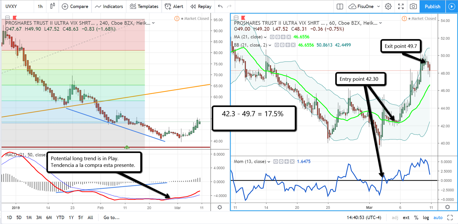 Para ver el momento correcto en el método FisuOne, se puede ir al gráfico de 1 hora a la derecha y cuando UVXY cruce la línea verde MA21 de abajo hacia arriba y al mismo tiempo, la línea azul de momentum cruce el nivel cero en la misma dirección, este es el punto de entrada, es posible buscar el punto de salida en dos momentos cuando UVXY cruza la línea verde MA21 en la dirección opuesta o cuando el precio comienza a lateralizar y eso sucedió en el final de la semana en el valor de 49,70 como en este ejemplo. Esto sucedió en la semana dentro de 4-8 de marzo de 2019.