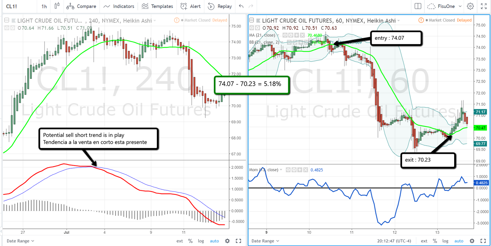 El futuro del petróleo se señaló al principio de la semana el domingo 8 que estaba dando una señal de potencial tendencia a la venta en corto por lo tanto se buscaron operaciones de venta en corto en el gráfico de la derecha y las mismas se dieron cuando el petróleo corto la línea verde de arriba hacia abajo la línea verde de 21 periodos como se explica en el método FisuOne® por lo cual al ir el precio de este futuro en el sentido contrario se termina la operación esta variación de precio brindo un 5.18%-