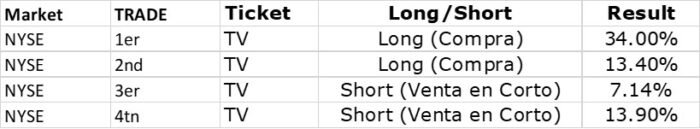 Aquí con el Grupo Televisa se puede hacer Trade tanto en el NYSE como en la BMV lo que pretendo mostrar con este trade es que se puede ir tanto en el sentido de la compra como en el de la venta en corto.