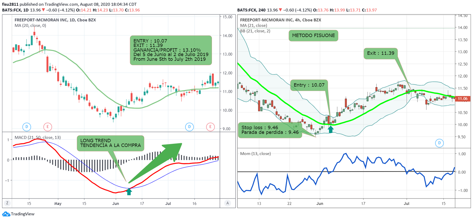 En el gráfico de la izquierda, que es un gráfico diario (Esto significa que cada barra es un día) busco la tendencia del instrumento financiero que estoy haciendo en este caso FCX.