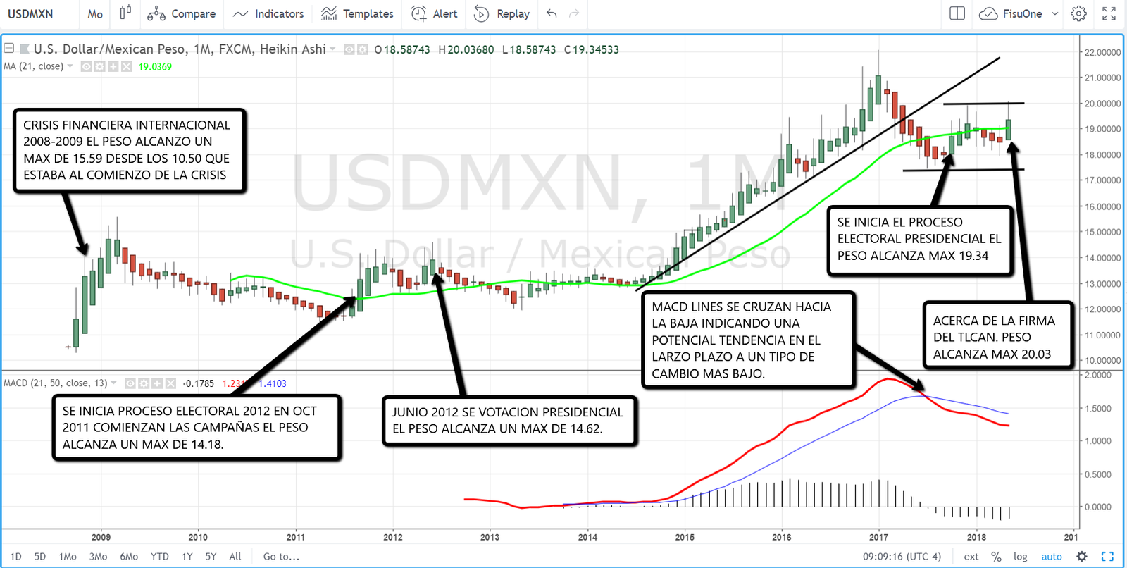 Desde lo técnico hay un condimento que lo trae las líneas de macd en esta grafica mensual donde se indican que en el largo plazo el peso debería recomponer sus valores a la baja pero a mi opinión esto dependerá de lo que se consiga en el TLCAN o futuros acuerdos bilaterales.